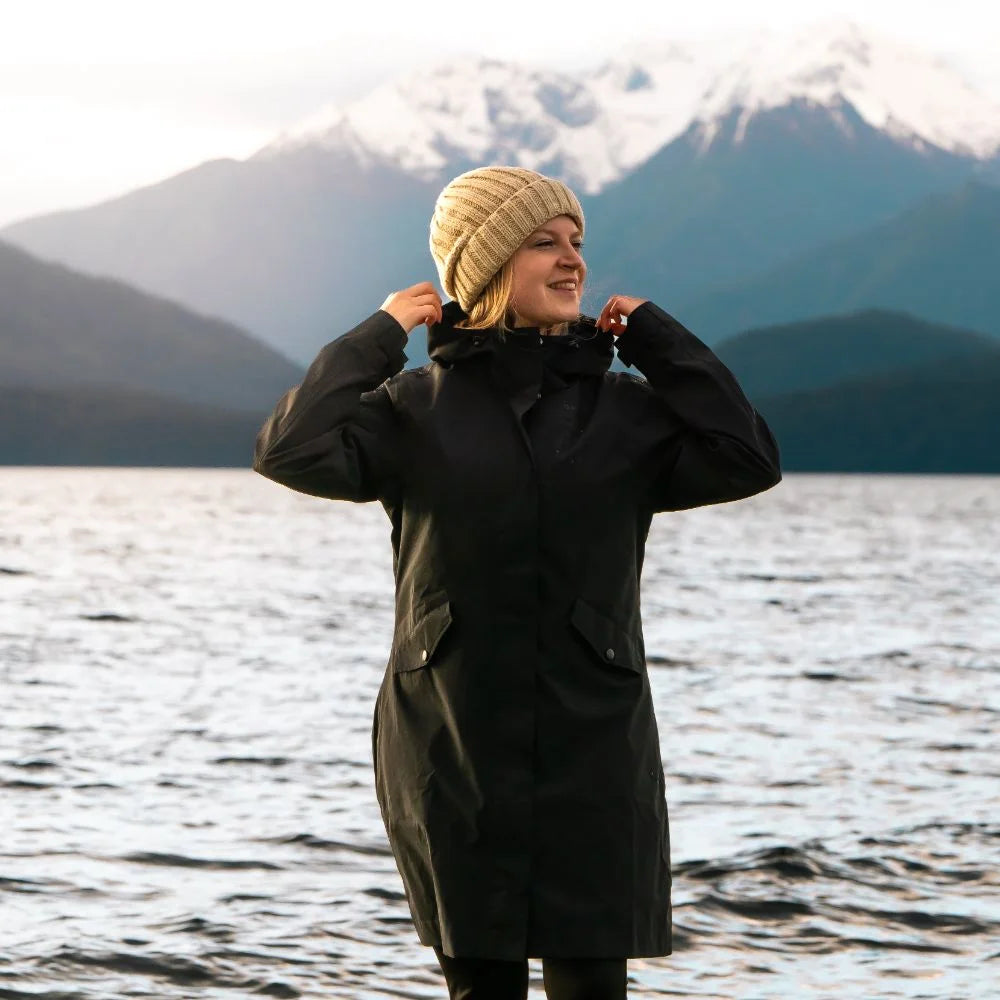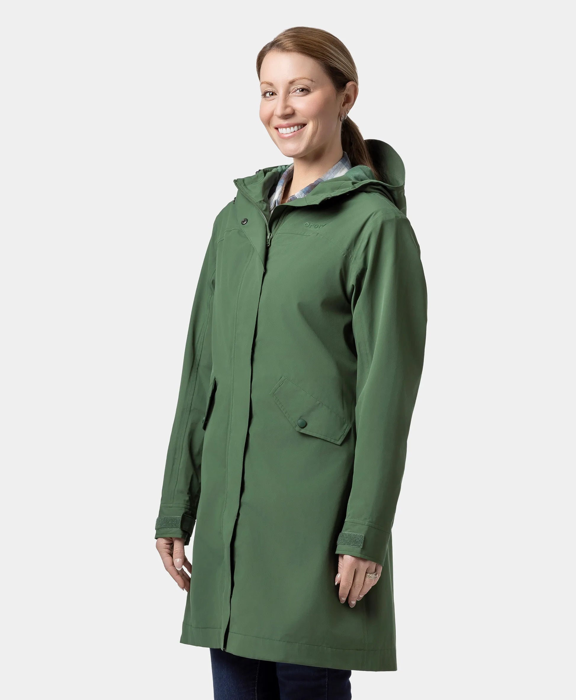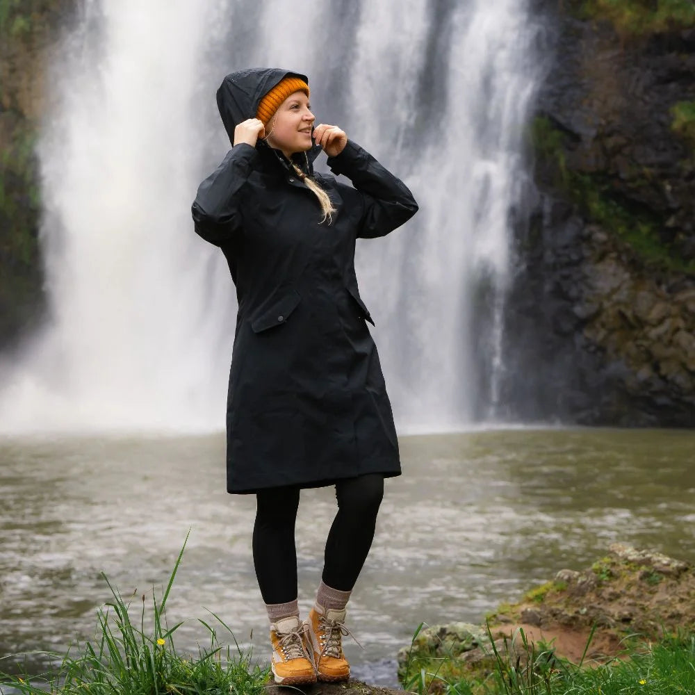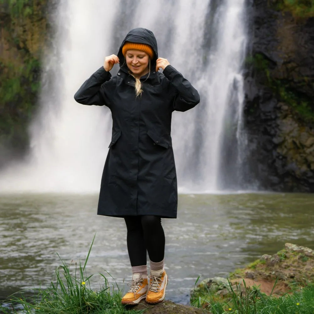 I really love the the fit and length of this rain trench and it kept we super warm and dry on wet days. Perfect for New Zealand's unpredictable weather! The jacket itself is comfy, the heating button is discreet and the material is good quality (not noisy and plasticky like some rain coats). After spending some time in the rain it does start looking quite wet on the outside but inside stays dry and toasty.