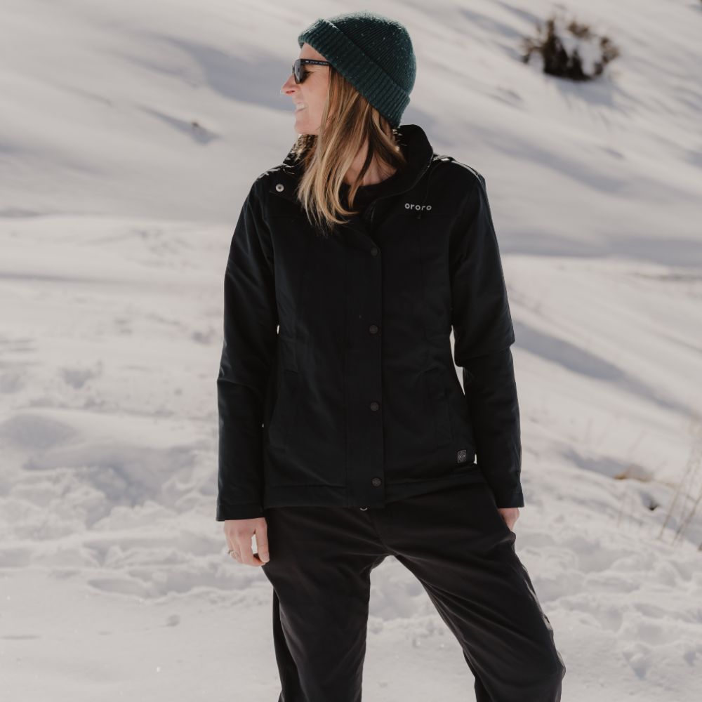 - Hidden battery pockets with zipper in the side seam maintain minimal protrusion of the battery.