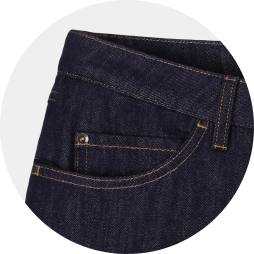 - Six pockets: two front pockets, two back pockets, a watch pocket, and a discreet side-seam battery pocket.