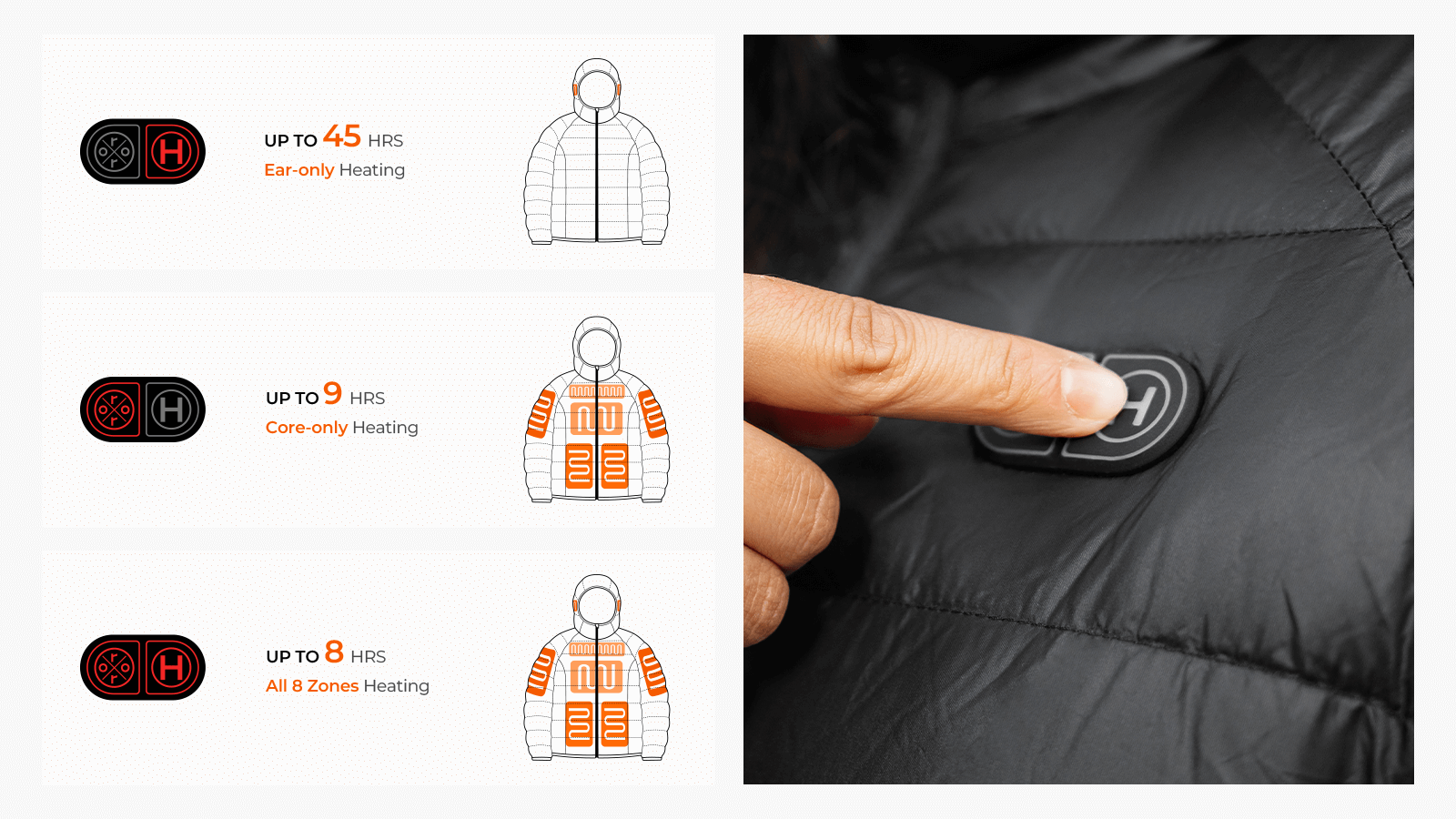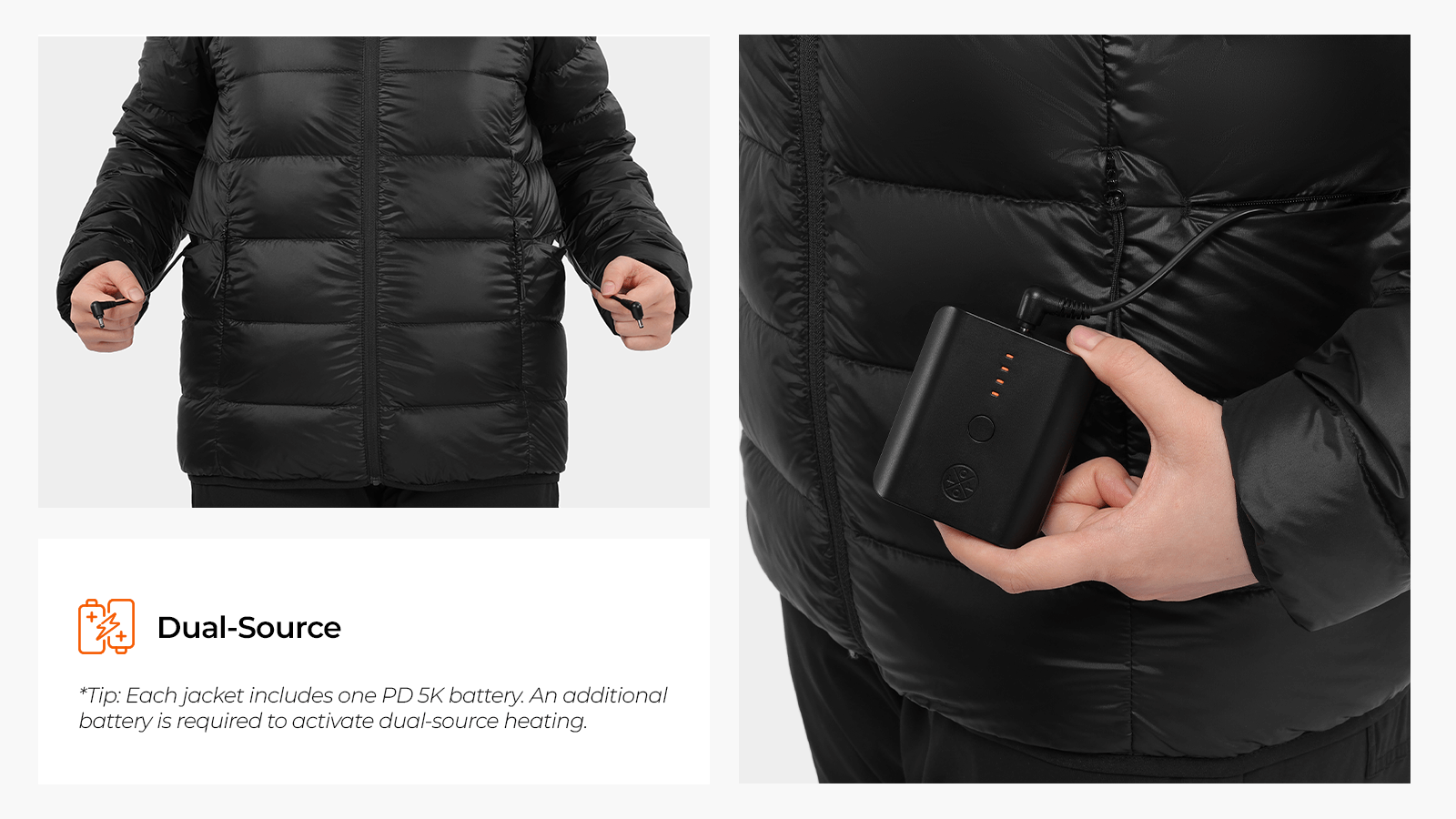 Stay powered longer in cold conditions with dual-source capability, allowing the use of two batteries at once for extended heating time — doubling runtime for up to 16 hours of all-day warmth.