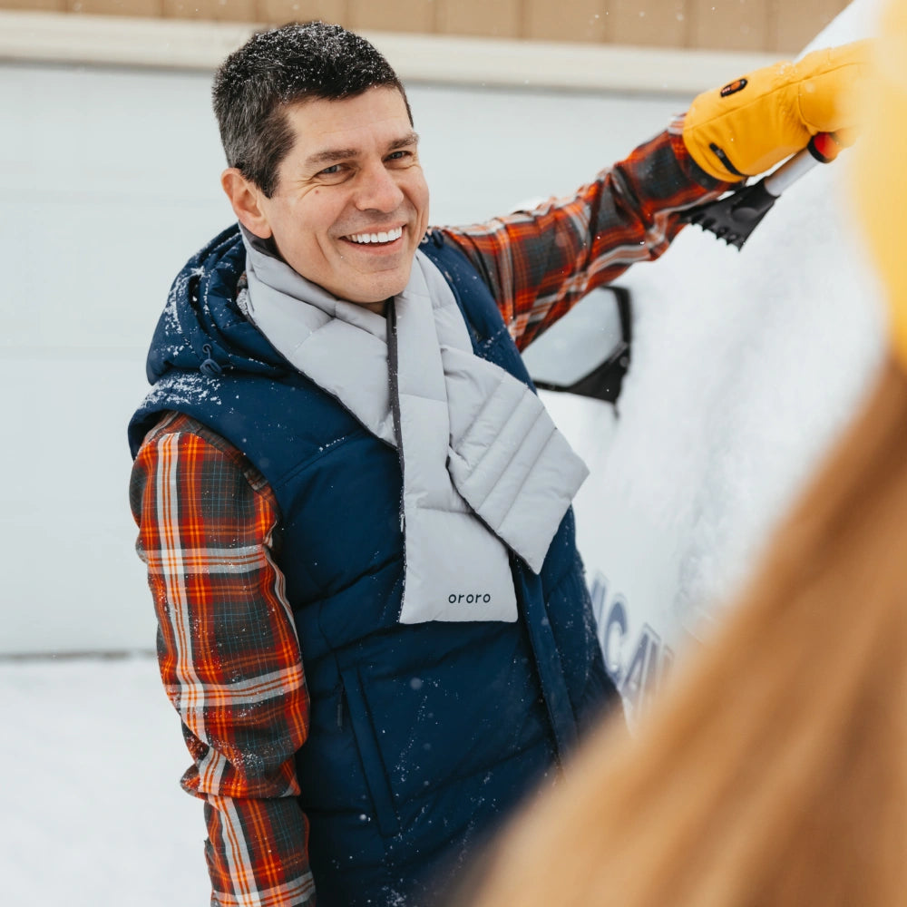 This down vest and the Lightweight Heated Down Vest both utilize the same 800-fill Responsible Down Standard (RDS) insulation and share identical heating zones and performance. However, this vest differs with a detachable hood, and snap-button fastening over the zipper, and is 5 ounces heavier. -