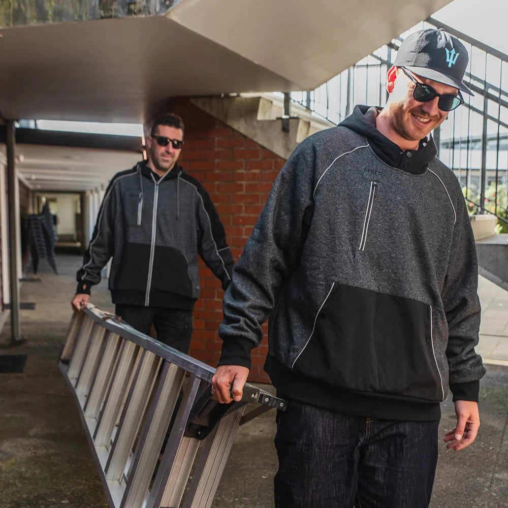 - It features a reinforced kangaroo pocket, a zippered chest pocket, and an external battery pocket.
