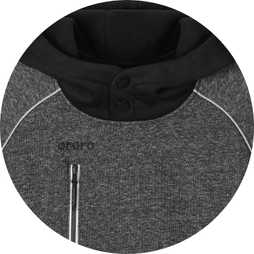 - Pockets: a kangaroo pocket, a zippered chest pocket, an external battery pocket